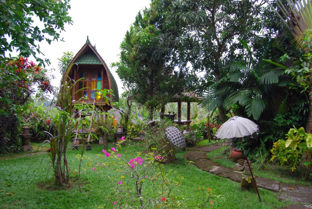 The photo above is of the water system that runs along the paddy fields to keep them fully hydrated. Farmers worked in the fields the same way the have been for hundreds of years while vast new hotel and villa developments were being built around them. It's a shame these new builds are not in keeping with the traditional Balinese buildings, instead they are modern flats a few stories high, where Balinese buildings are usually only bungalows or two stories high. They were a bit of an eye sore amongst the lush paddy fields but ubud is growing more popular every year so I guess they'd say they need to meet the demand! We came across a lovely remote homestay, Matahari Lumbung (the room rate seemed very reasonable and would love to stay there if we return), owned by a super friendly German man who we chatted to over lunch and where we were served the best nasi & mie goreng so far. His bungalows and grounds were beautiful, full of art he has collected across South East Asia.