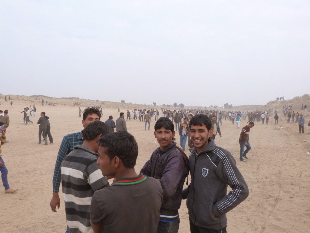 Everyone started swarming and running around to the guy who got hit, all the while the camels were still running around. I'm surprised no one was seriously hurt or at least no one to our knowledge. We were the other centre of attention again although not in a fun and consenting way like the first day. There was no escaping the crowds. We were a group of 8 tourists of maybe 20 tourists there in total. We stood still for 1 minute and we'd have a crowd of young Indian men encircling us laughing taking photos of the girls. For a little while this is annoying when it's all day it starts to become uncomfortable as such 4 or so hours of camel festival we decided was plenty and we decided to head back early missing another 'grand cultural evening' judging by the last one we didn't miss much. On the way back Jitu the guesthouse owner told us his father had called to check we were all ok as fights had broken out at the event between police and villagers, nothing too serious but it really was the sort of atmosphere where something had to kick off. Not a drop of booze in sight just over excited large groups of blokes, bit like the Sunday night of Reading festival, in the desert.